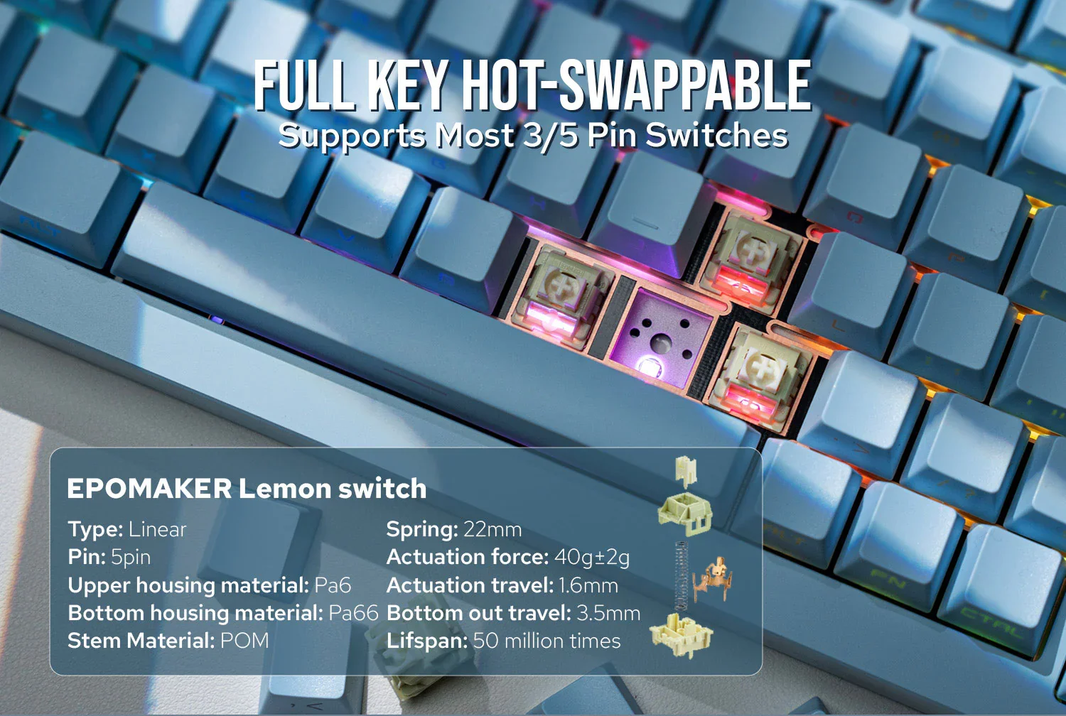 Tide 65 와 Tide 75 는 모두 QMK와 호환되므로 키 매핑 및 매크로의 포괄적인 프로그래밍 가능성과 커스터마이징이 가능하여 워크플로우 또는 게임 설정을 세트 수 있습니다. 핫 스왑 가능한 PCB를 사용하여 사용자는 납땜 없이도 원하는 스위치로 쉽게 교체할 수 있으므로 개인화와 편의성을 극대화할 수 있습니다.